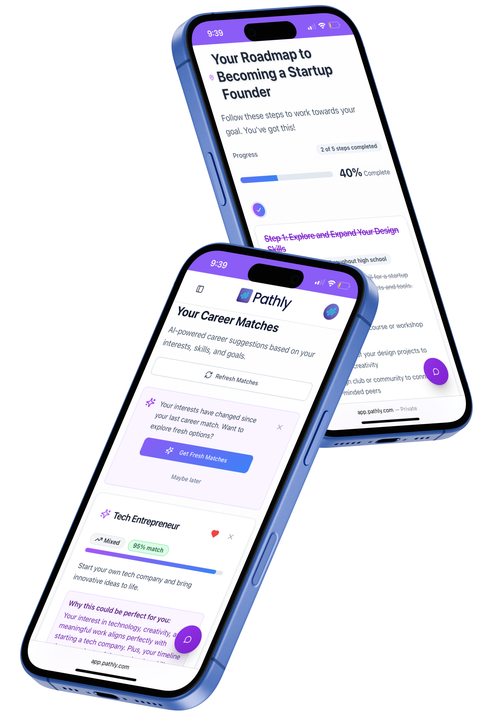 Pathly helps you discover careers that actually fit, build step-by-step roadmaps, and take real action toward your future.
